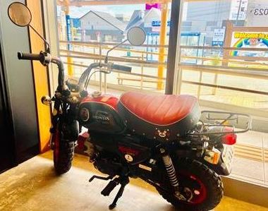 奥のスペースは”くまモンの秘密基地”を感じることができる、アメリカンカジュアルな空間が広がっています。レトロなミニカーや小物、プレート、くまモンが海外に行った時の思い出の写真などがたくさん飾られています。また、本田技研工業のオートバイ「モンキー」のくまモンバージョンも展示されていて、フォトスポットにぴったりです。ぜひ遊びに来てください!